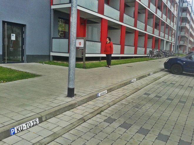 Кроме самих зданий, обновлению подверглась и прилегающая к ним территория. Обратите внимание на то, что тротуар не просто значительно выше проезжей части, но еще и отделен от нее буферной зоной, чтобы припаркованные автомобили не отнимали пространство у пешеходов. Сами парковочные места привязаны к квартирам и пронумерованы.