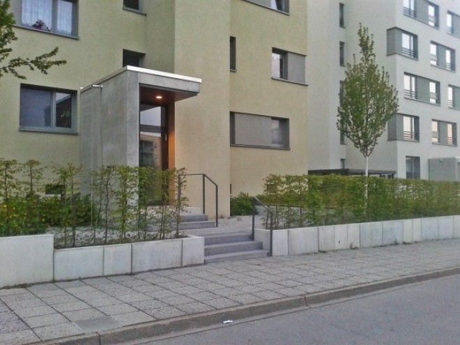 Подход к дому защищен от дороги невысокой бетонной оградой, за которой насадили зеленые кустики, разбавляющие избыток серого цвета.